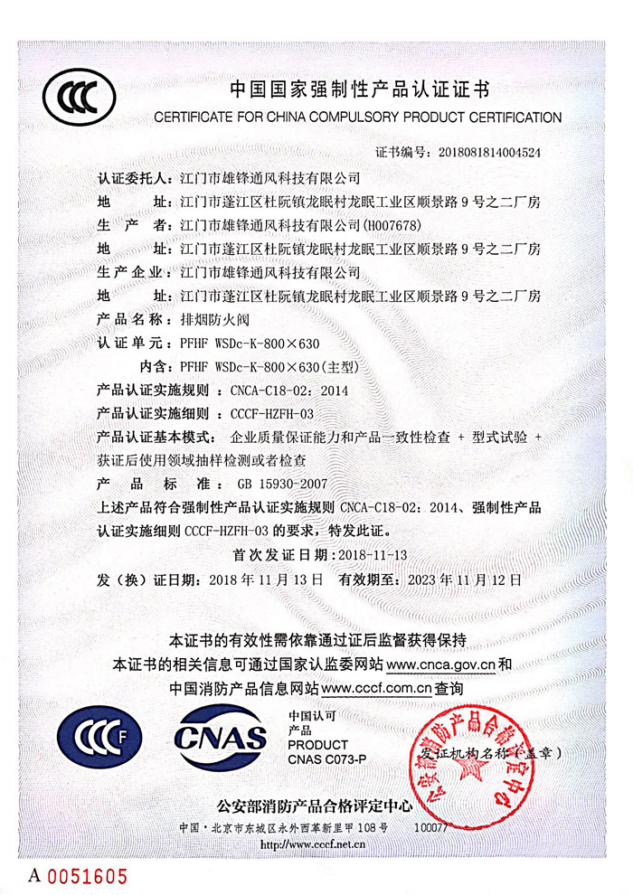 排煙防火閥產(chǎn)品認(rèn)證證書2